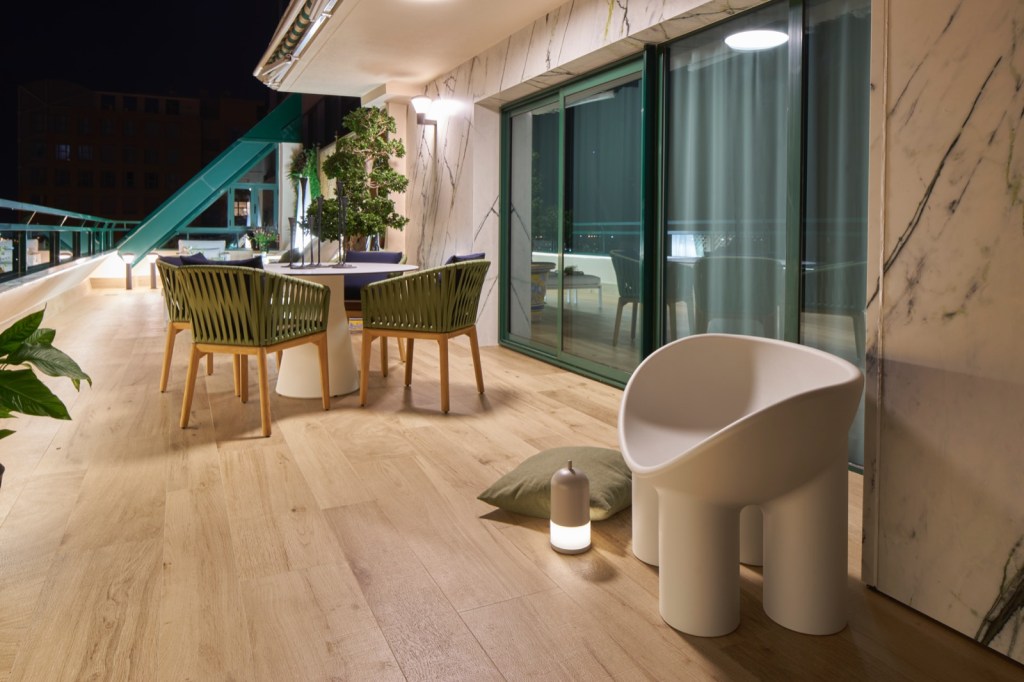 El suelo se ha cubierto con un gres porcelánico imitación madera de Porcelanosa, modelo PAR-KER Manhattan. Y las paredes se han panelado con el porcelánico XTONE Calacatta Green de gran formato, también de Porcelanosa. Además, se utiliza las ventajas de este mismo material para generar una zona de almacenaje y ocultar instalaciones. El color verde de las vetas combina con la cromática de la arquitectura del edificio.