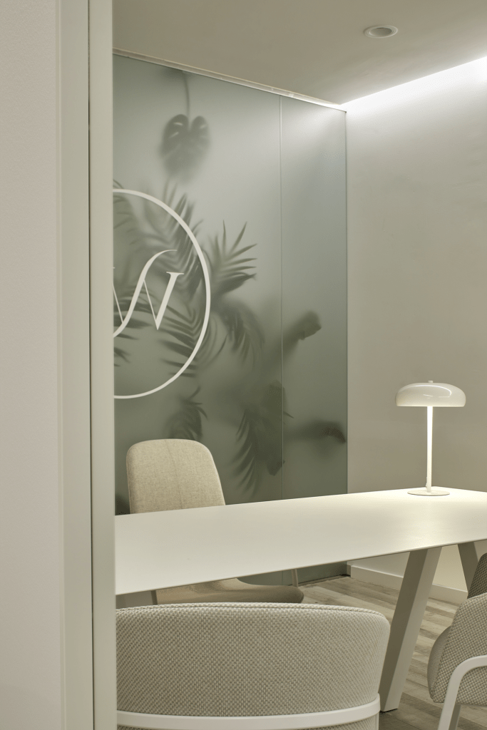 El color lo encontramos al fondo de la recepción, donde un vídrio vinilado deja entrever la vegetación presente en la mayoría de los box sanitarios.
