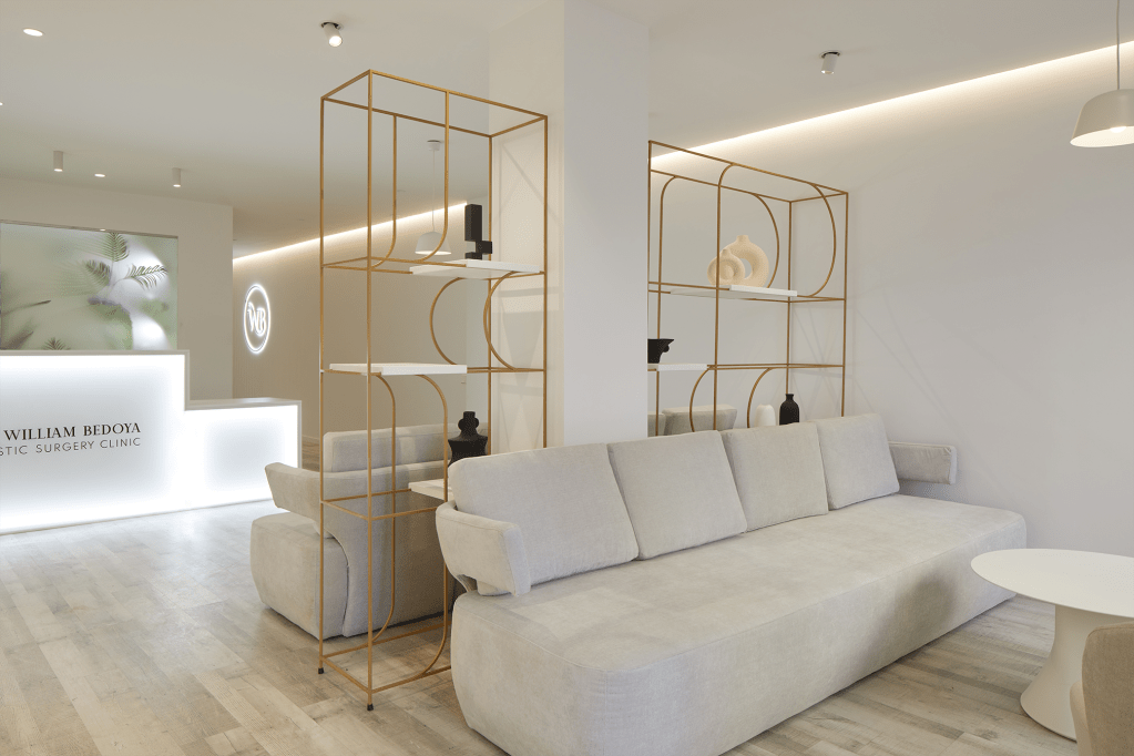 Cuando los pacientes llegan a la clínica, les acoge un espacio de espera que tiene como protagonista una geométrica estantería dorada. Todos los elementos en tonalidad beige, incluido el pavimento vinílico, se conjuntan para transmitir una sensación de relajamiento. El led retroiluminado destaca con elegancia elementos de interiorismo.