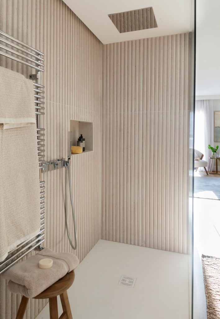 El elemento común de las habitaciones es la tonalidad beige en paredes y un suelo multicapa de madera de roble. La excepción son los cuartos húmedos (cocina, lavandería y baños), donde hemos optado por gres de 20*20. La cristalera que une el salón-comedor con la cocina ha sido diseñada por Majo Flores, compuesta por cristal y varetas de roble.