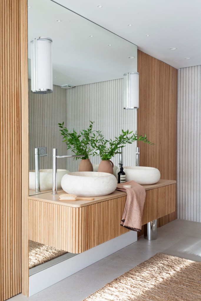 El vestidor queda oculto a través de un panelado de madera que une la habitación principal con un baño abierto al dormitorio. El mueble de lavabo, con dos senos de piedra, ha sido diseñado por Majo Flores. A la derecha puede verse el lavabo del dormitorio de invitados.