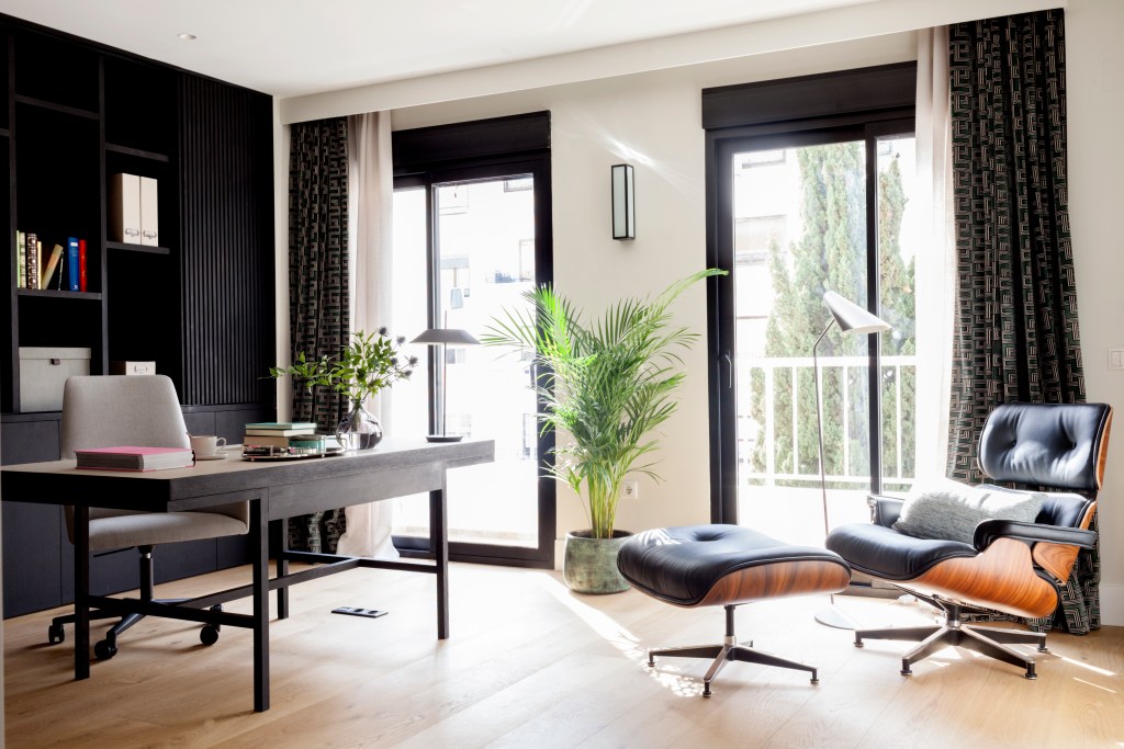 El roble se tiñe de negro en el despacho, también en la zona más tranquila de la vivienda. Cuenta con diversas iluminaciones, que acompañan el trabajo y la lectura.