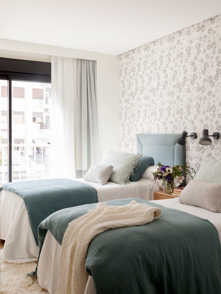 Motivos vegetales en tonos grises y malva destacan en el dormitorio de invitados, que cuenta con dos camas gemelas con cabeceros tapizados.