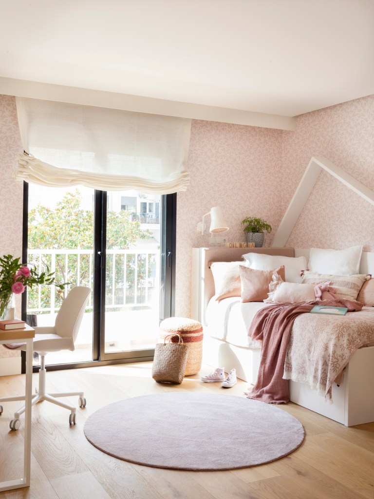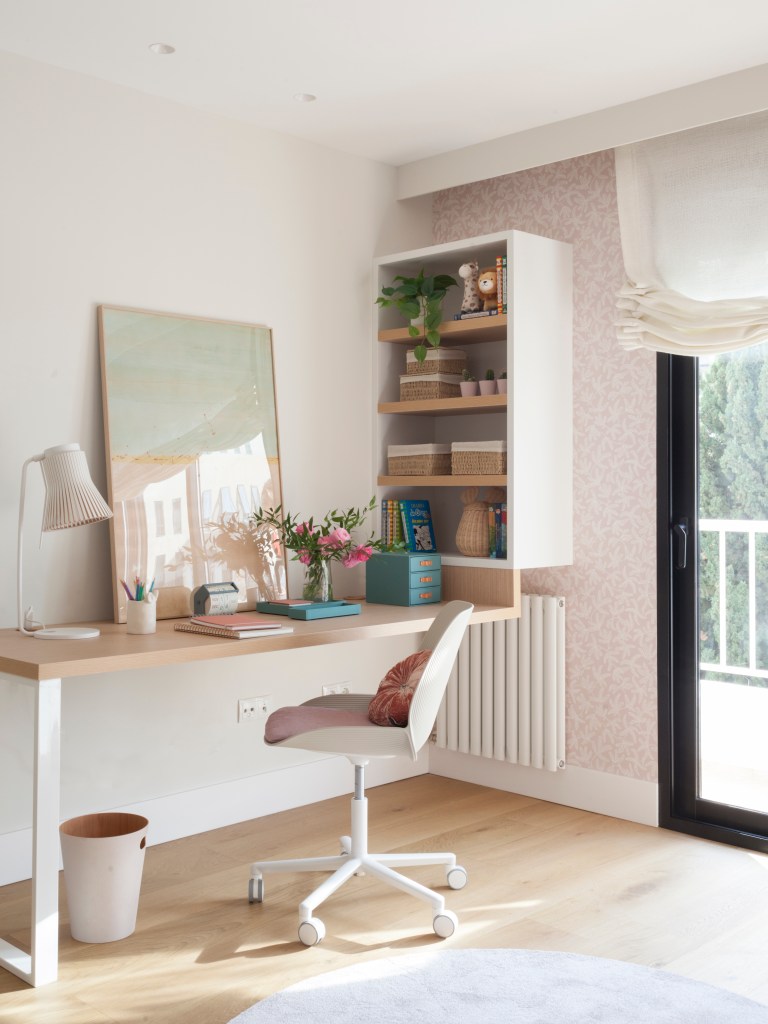 El mobiliario del dormitorio infantil fue diseñado a medida por el estudio de interiorismo de Majo Flores y elaborado por Cerveró Obras. Si bien el blanco es el tono protagonista, el roble deja su imprenta en el escritorio y los estantes de la librería. Las paredes de la cama se revistieron con un friso de madera a medida y papel pintado.