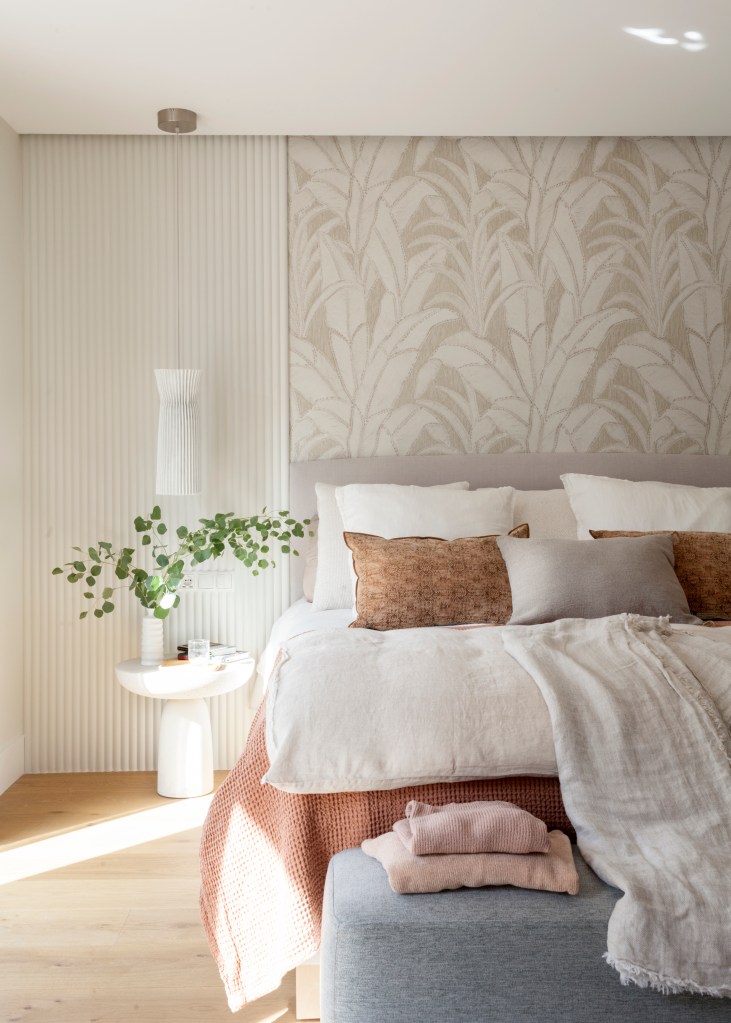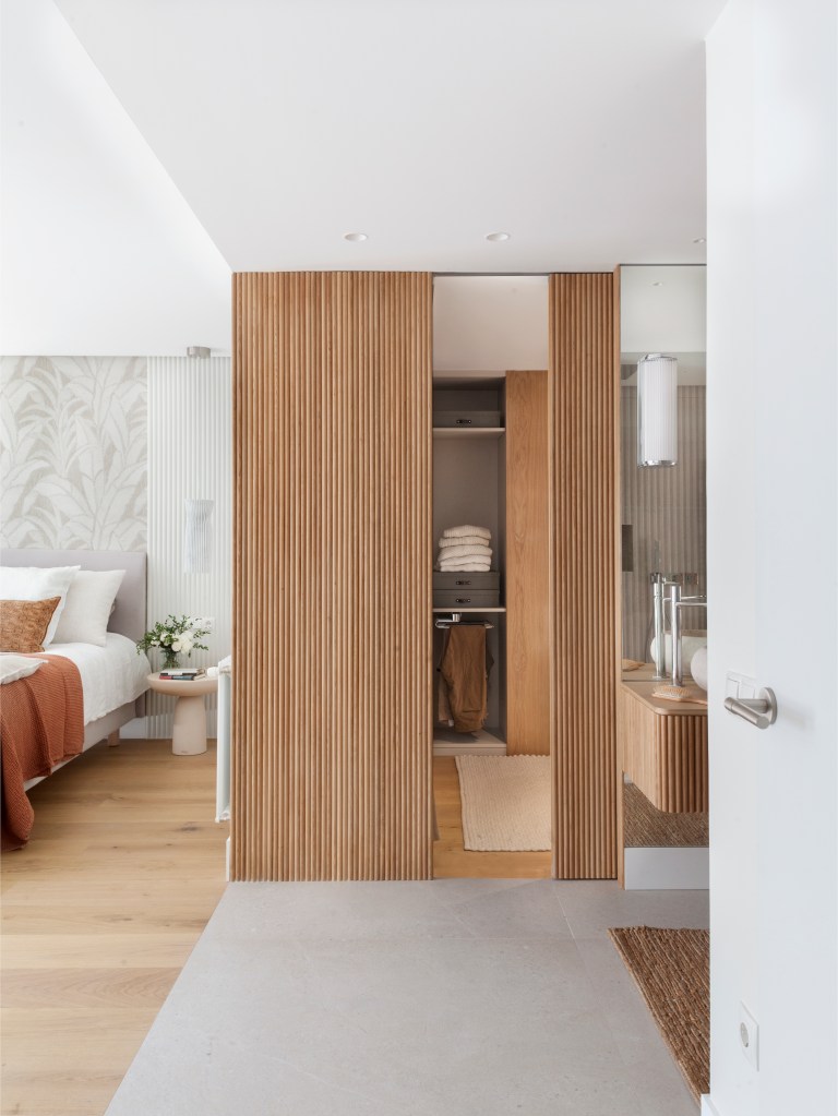 La casa cuenta con tres dormitorios: el principal en suite y con vestidor, una habitación infantil y otra para invitados. Todas ellas se ubican en la zona más alejada de la calle. La calidez de los dormitorios se consigue con paredes revestidas de papel pintado y paneles decorativos.