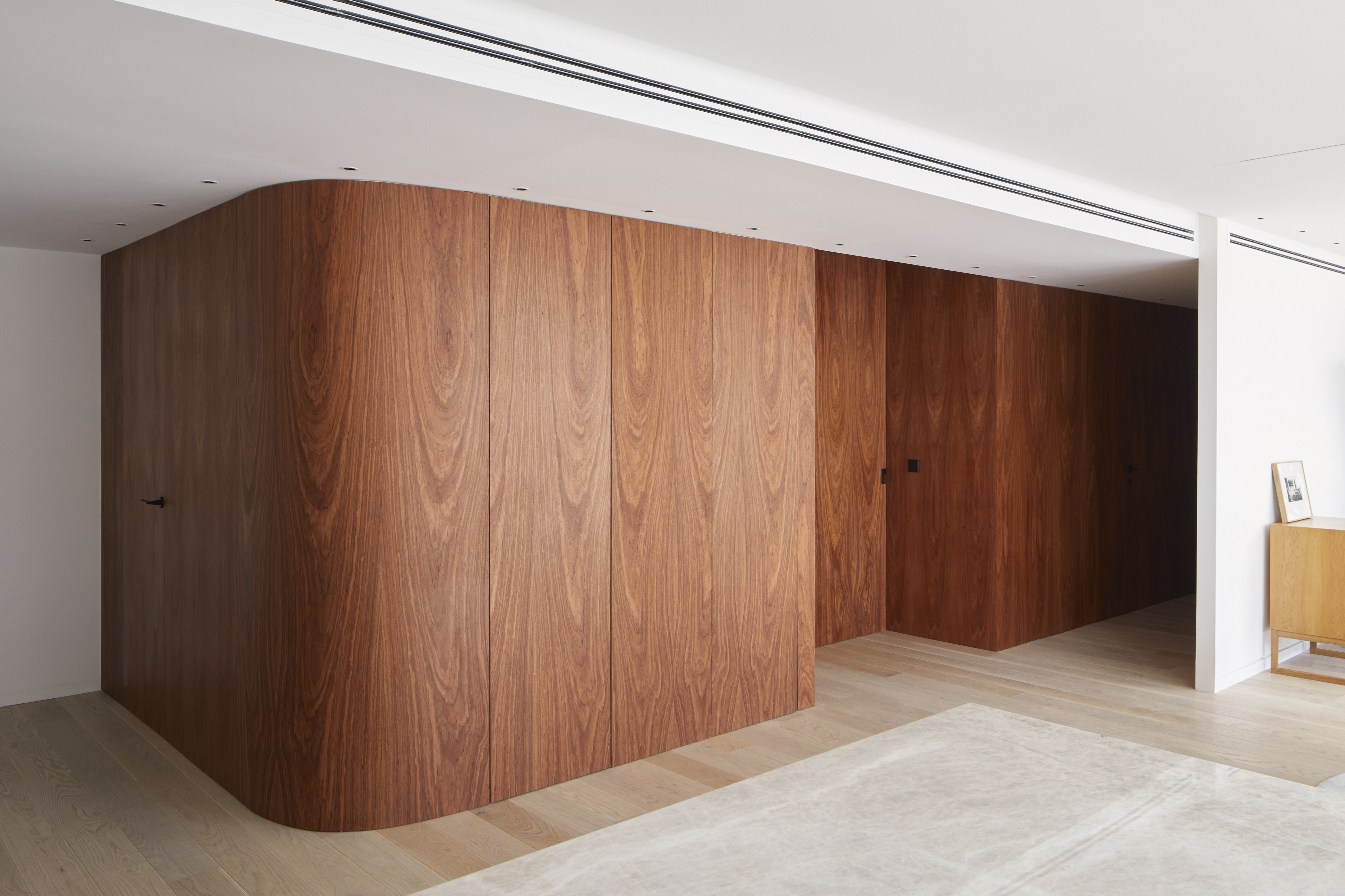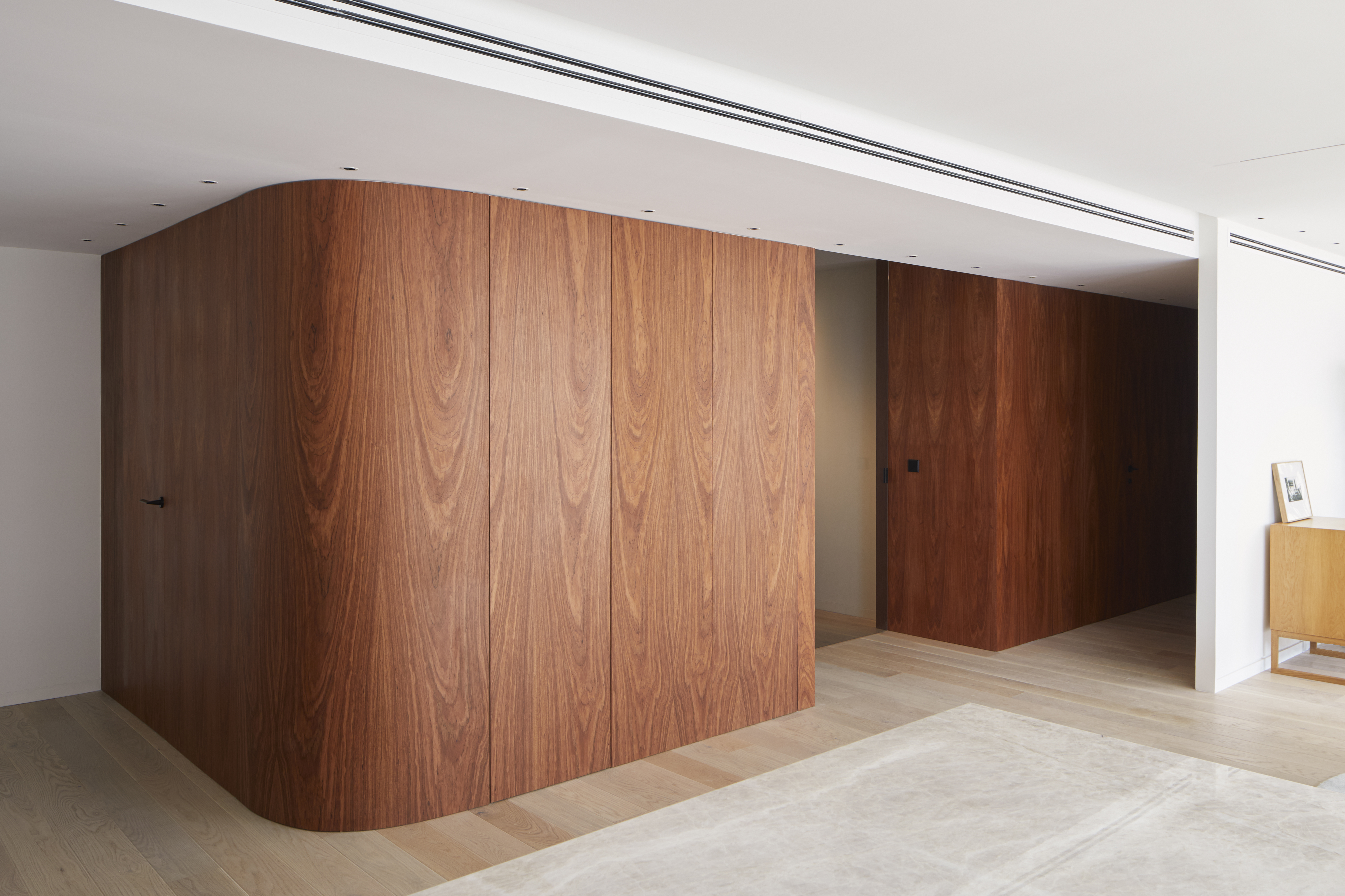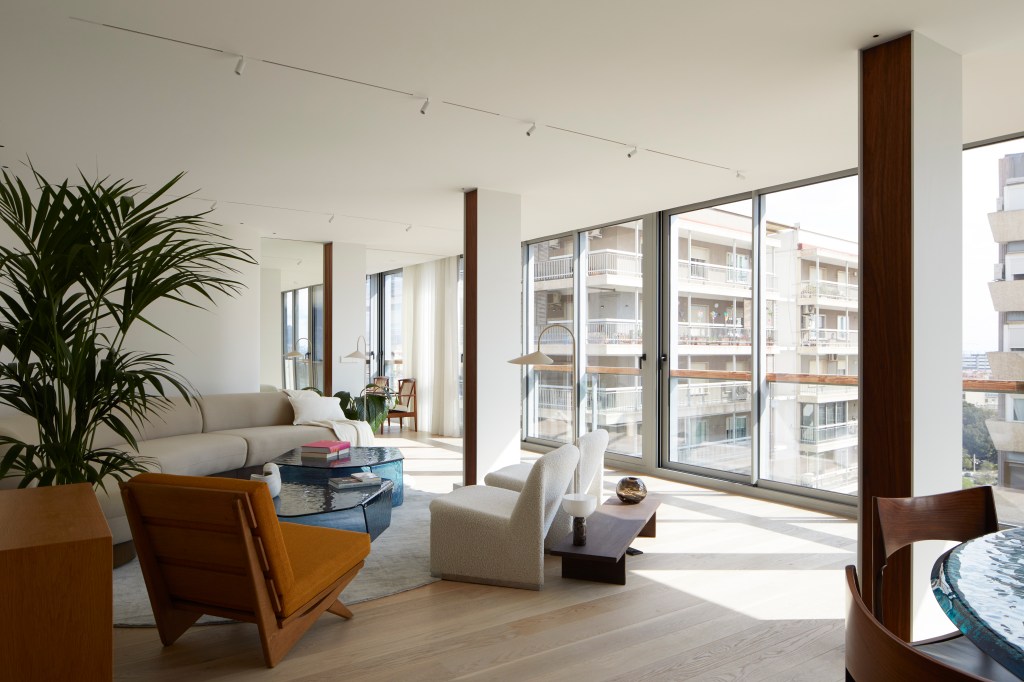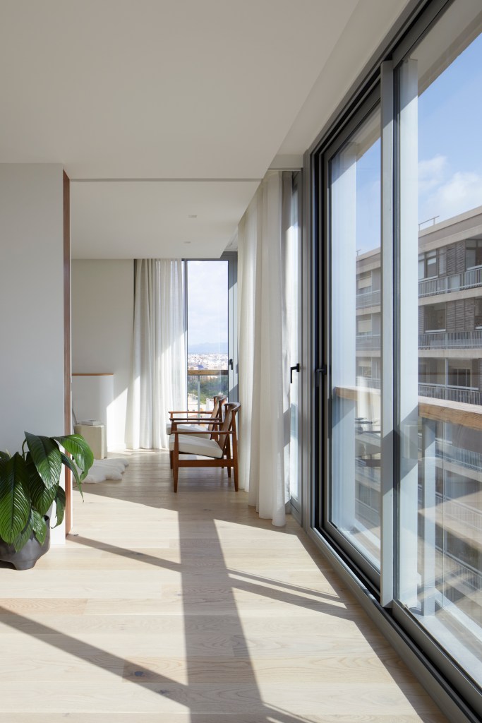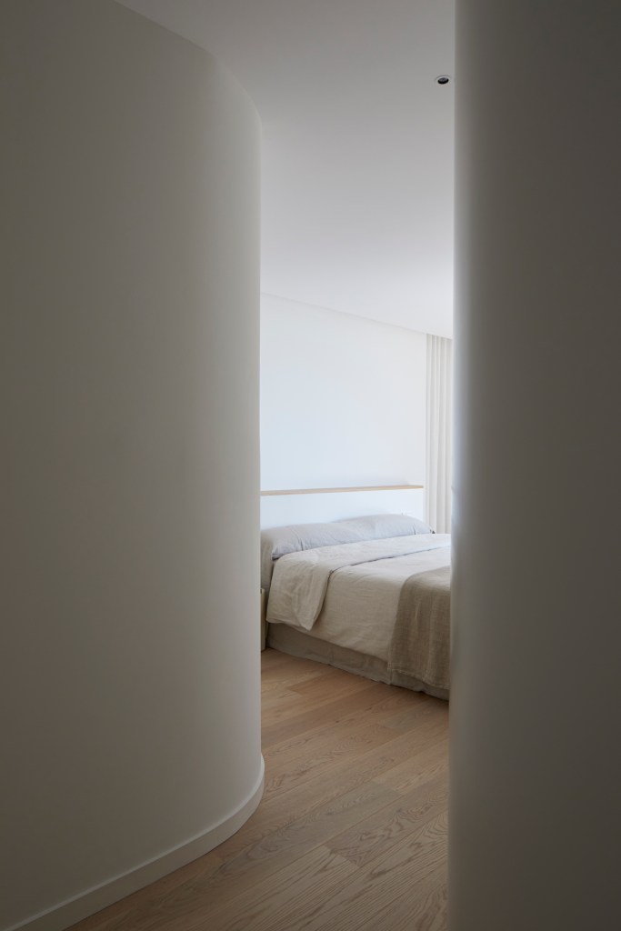 Al antiguo cauce del río Turia miran el salón, la cocina y el dormitorio principal. Las paredes curvas añaden un toque de sofisticación y exclusividad a la vivienda, transmitiendo una sensación de movimiento y continuidad, al tiempo que hacen que una habitación parezca más armoniosa y acogedora.