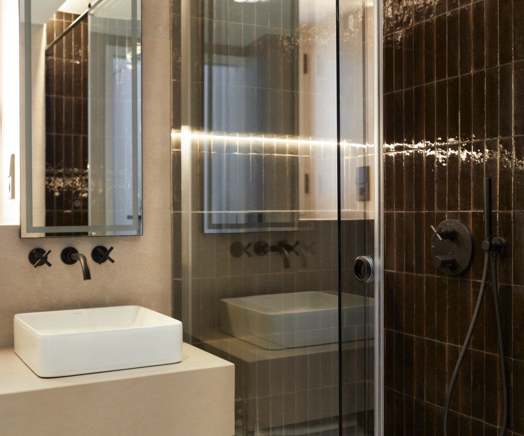 La cocina, de diseño sofisticado y minimalista, destaca por los materiales de alta calidad. Los acabados en madera oscura contrastan de manera armónica con las superficies claras, creando un ambiente cálido y moderno. La estancia está iluminada por grandes ventanales que permiten la entrada de abundante luz natural. Los detalles funcionales, como el grifo negro mate y los electrodomésticos integrados, reflejan un diseño pensado para la comodidad y la practicidad, sin sacrificar la estética.