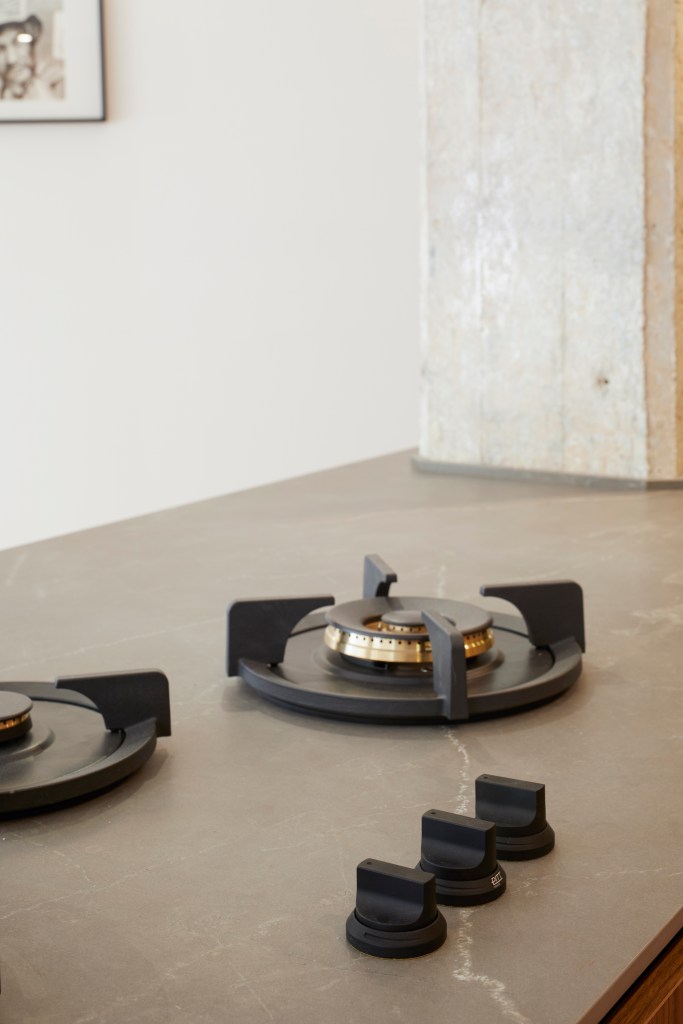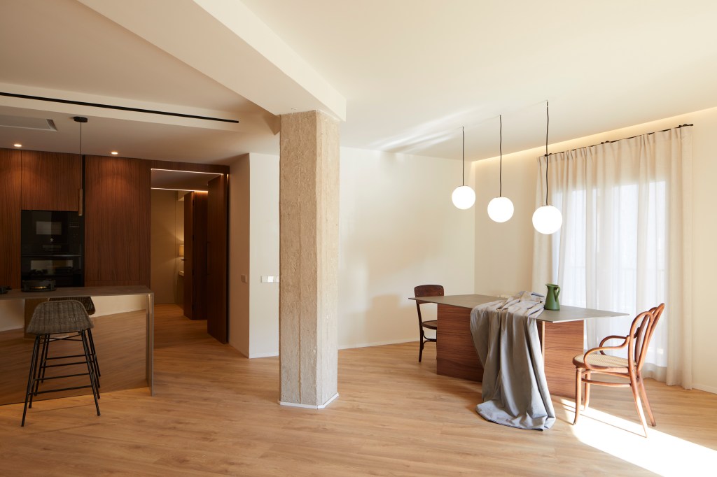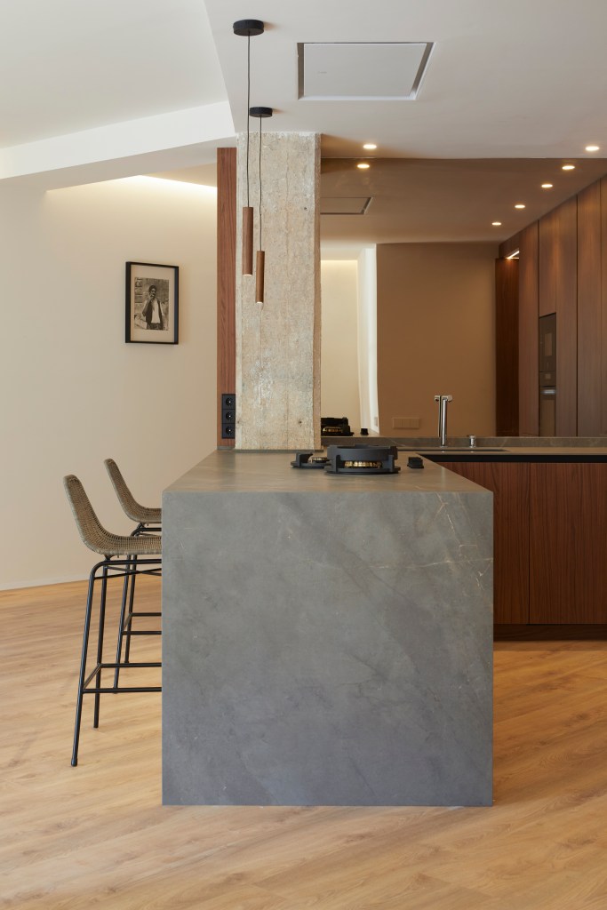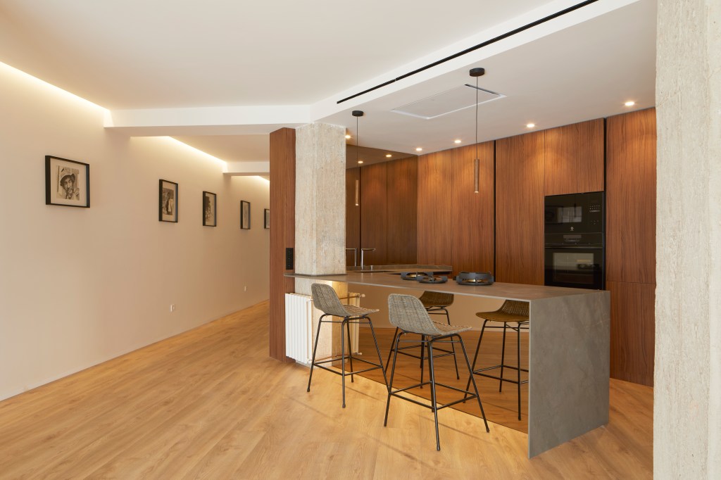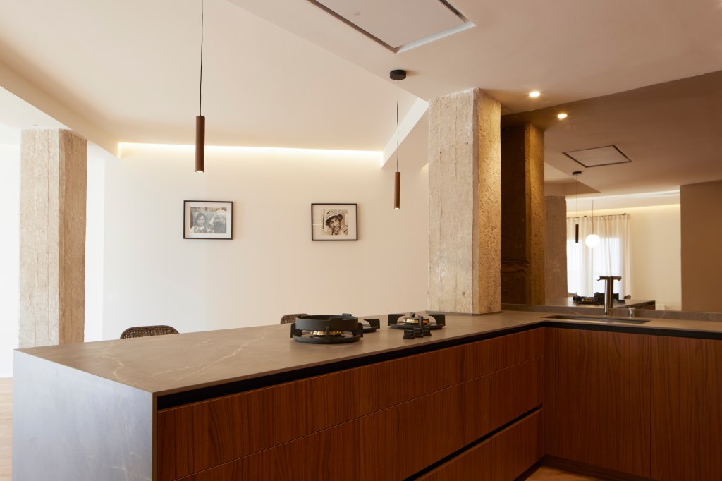 Uno de sus mayores atractivos es el amplio salón, que integra una elegante cocina donde poder disfrutar conjuntamente de la gastronomía. Diseñada por Luis Cerveró, se compone de frentes en madera de nogal que permiten ocultar electrodomésticos y la puerta de paso a los dormitorios. Cuenta con una península, elaborada con porcelánico de TAU Cerámica -imitación piedra natural- y un faldón en espejo tono cobre con el que se gana amplitud espacial (potenciada además con una iluminación indirecta situada en el inferior de la mesa de trabajo). Los fuegos de PITT Cooking quedan totalmente enrasados a la misma encimera, liberando prácticamente toda su superficie.