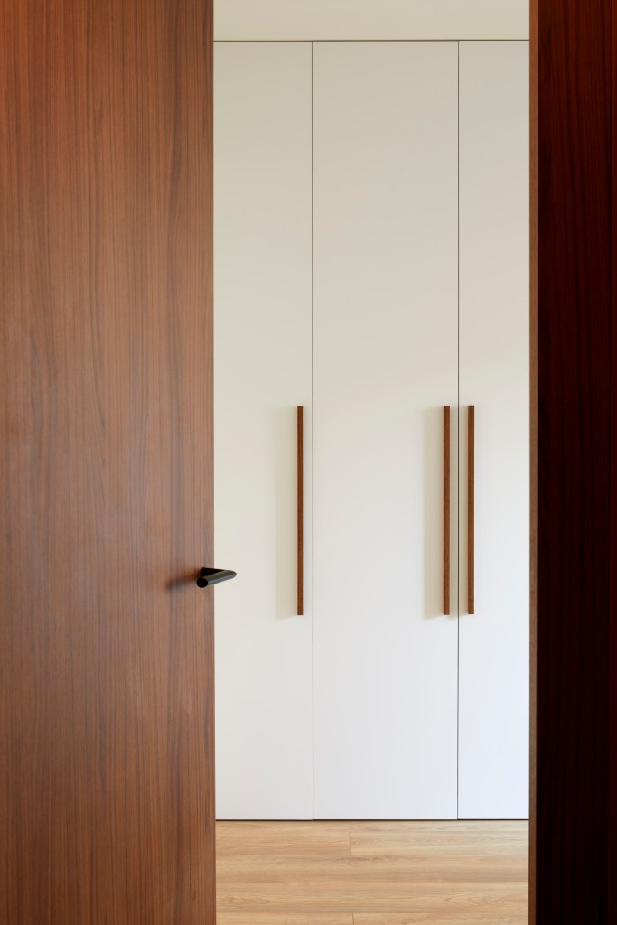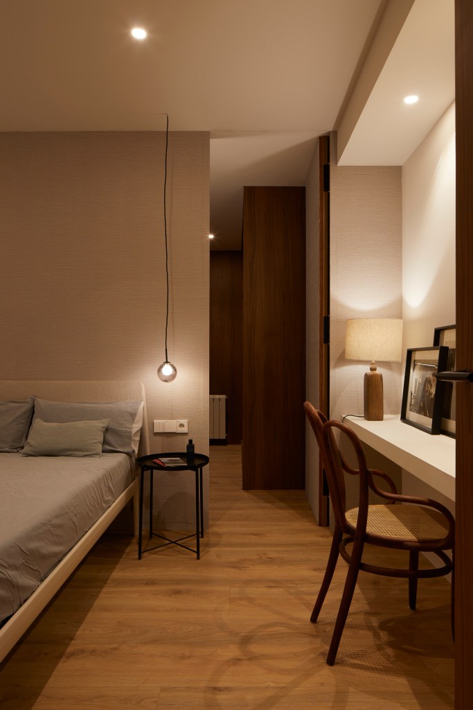 El dormitorio en suite se acompaña de un escritorio y un vestidor en madera de nogal, al que se accede a través de una puerta panelada.