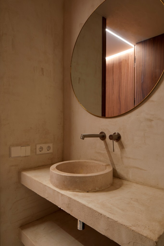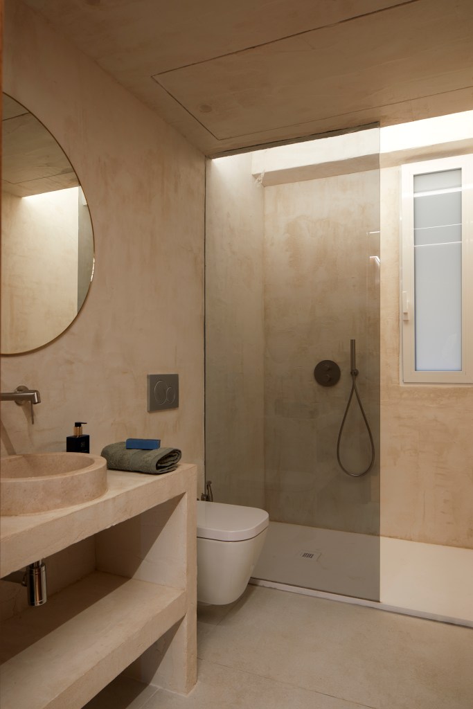 Ambas comparten un baño de estilo toscano, revestido con morteros a la cal. Cuenta con amplia ducha y un lavabo.
