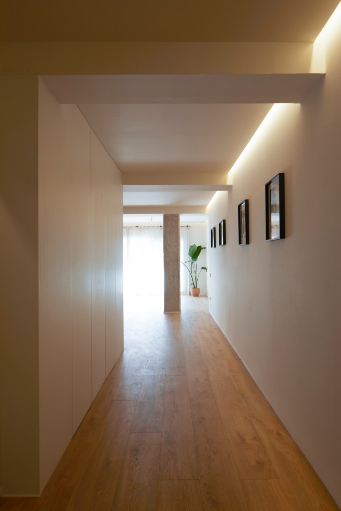 La luz de la terraza exterior recorre la entrada de la vivienda, donde tras un panelado de madera en blanco se oculta un gran espacio de almacenamiento y lavandería.