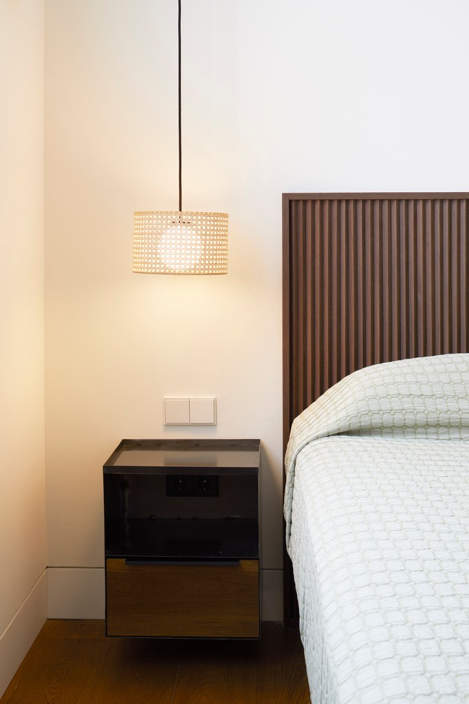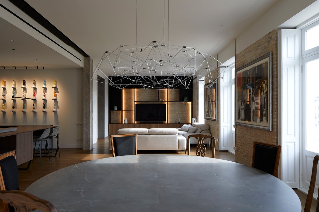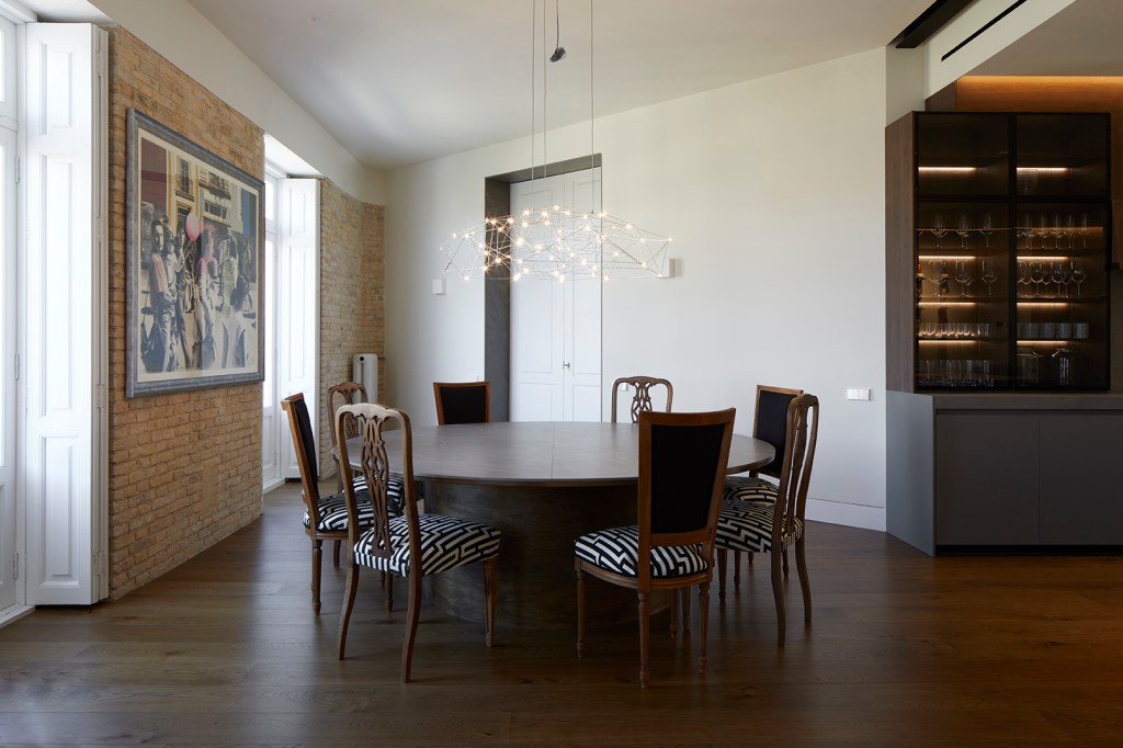 El salón se distribuye en tres espacios: el comedor, la cocina y la sala de estar. La mesa principal que preside el comedor está elaborada con nogal y porcelánico de Ascale de 12 mm. Convive con ocho sillas restauradas. Les acompaña la lámpara de Quasar, Cosmos Disc. Su diseño pasa desapercibido en las horas de luz natural para poder dar protagonismo a las obras de arte que le acompañan.