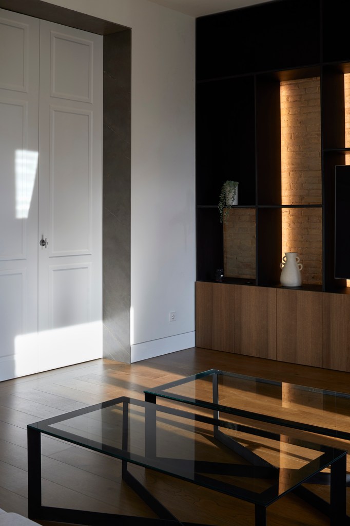Preside la sala de estar una estanteria hecha a medida, realizada con roble teñido en negro y chapa metálica. La retroiluminación resalta los ladrillos caravista de los muros de la vivienda.