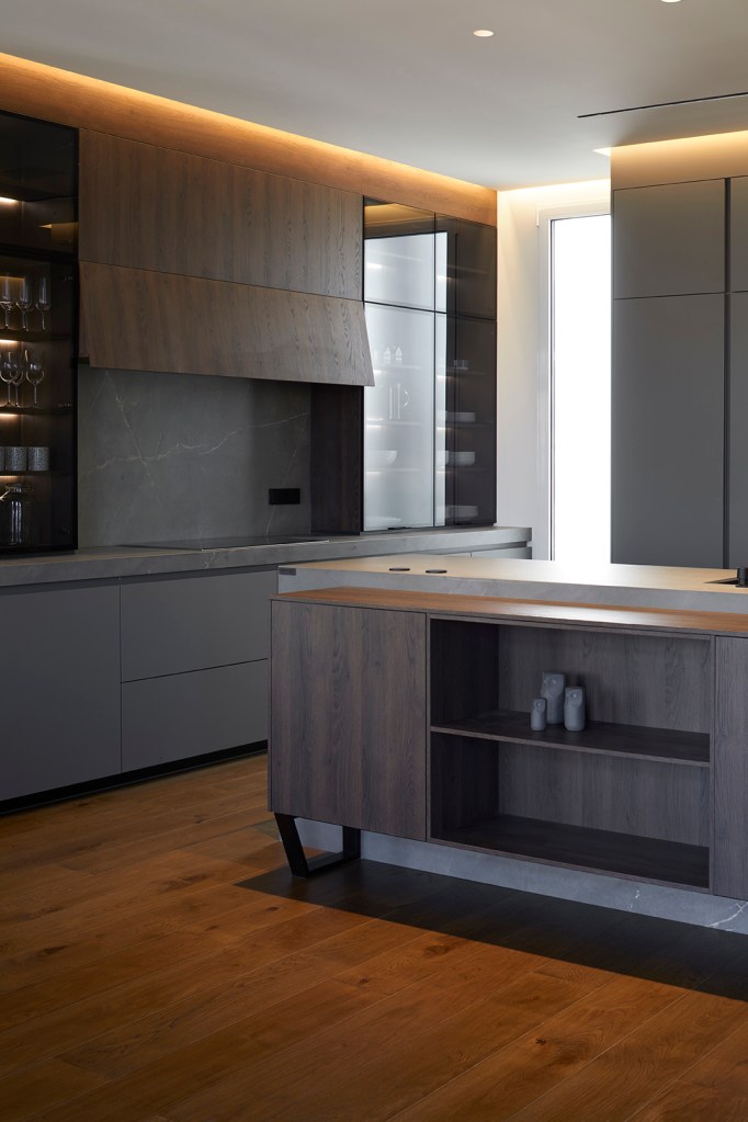 A pocos metros, se encuentra la isla de la cocina, diseño de Santos e instalada por Entrecuines. Sus dos materiales principales son el nogal americano y el porcelánico Ascale.