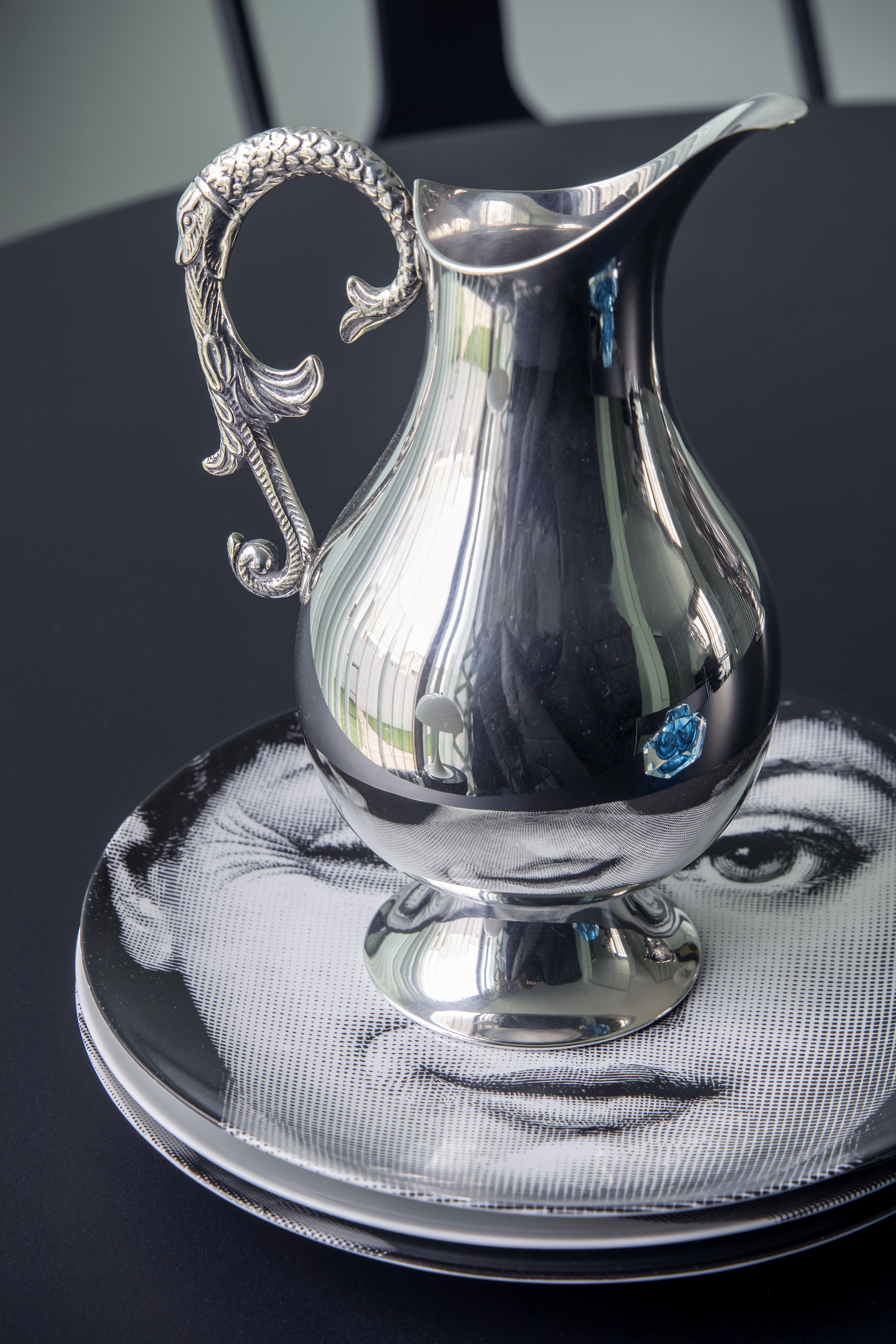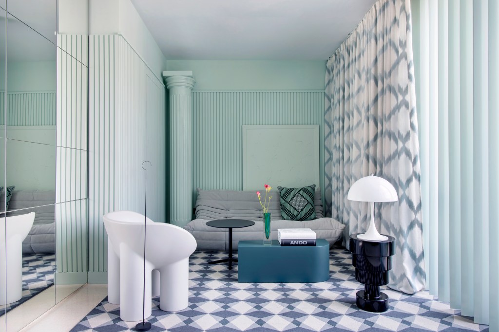 La presencia de elementos clásicos —como columnas acanaladas, molduras decorativas o papel pintado con referencias al arte grecorromano y al teatro ilustrado— dialoga con piezas de diseño contemporáneo, lámparas icónicas y objetos decorativos de fuerte carga simbólica.