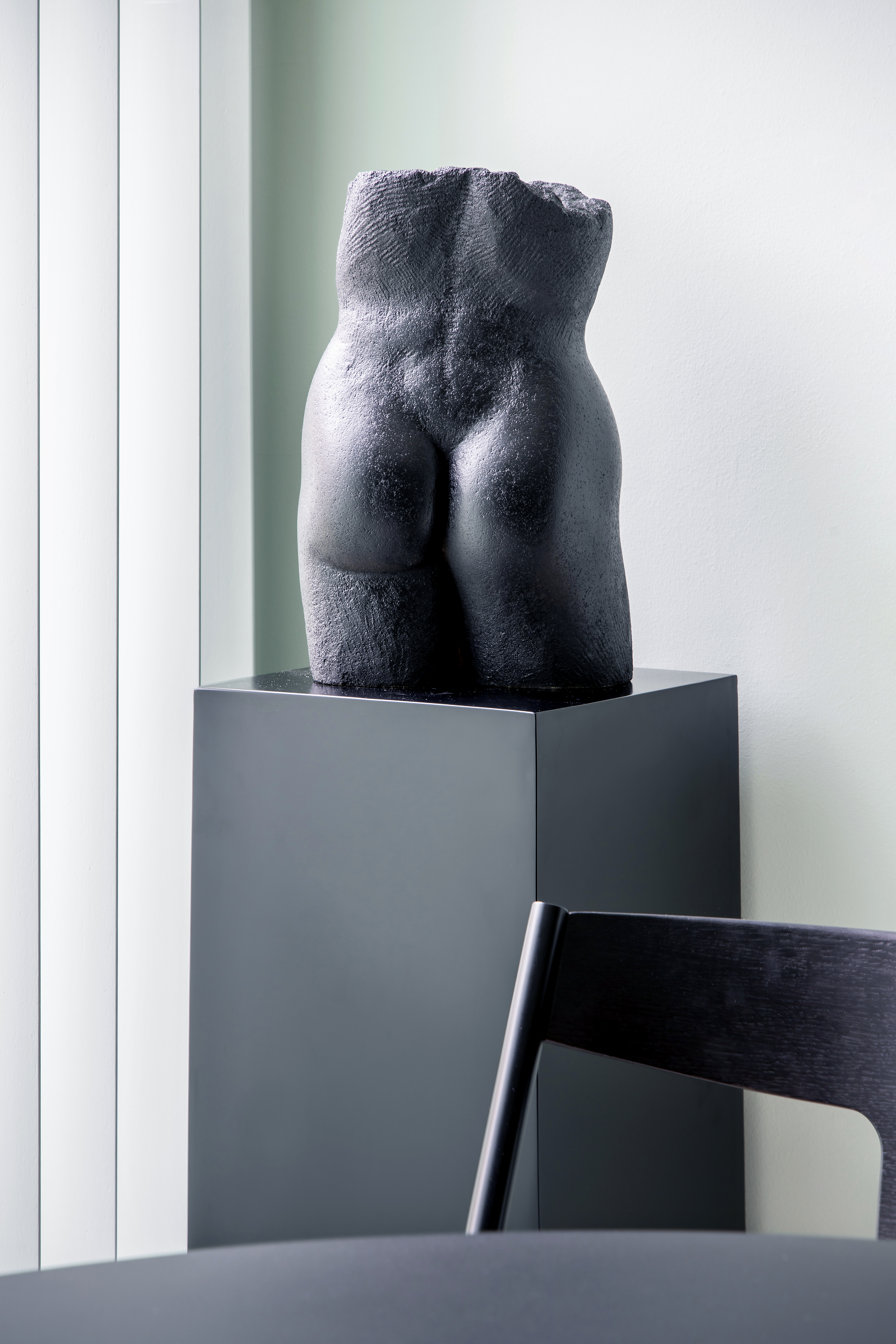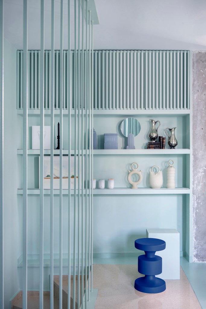 En contraste con la paleta menta que predomina en el resto de la vivienda, este baño se sumerge en una atmósfera más oscura e intensa, donde el negro, el mármol y el hormigón estructural componen una escena de fuerte carácter. Frente al espejo dorado de inspiración barroca, la silla de diseño icónico en acabado brillante y la lámpara azul eléctrico introducen acentos futuristas. Por su parte, el techo inclinado en hormigón visto subraya la arquitectura original del espacio. El conjunto funciona como una cápsula teatral, sofisticada y sorprendente, que cierra el recorrido por la vivienda con una nota de audacia y contraste.