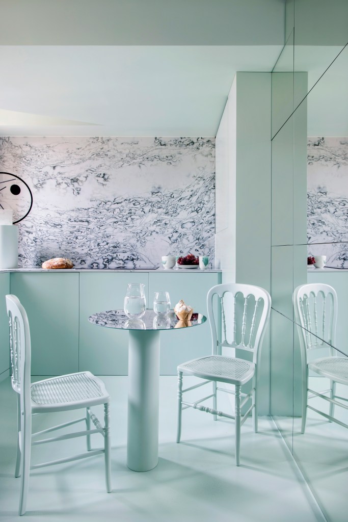 La cocina sorprende por su minimalismo cromático y su tratamiento matérico. Las superficies lisas en verde menta contrastan con el potente veteado del revestimiento mural, que recuerda al mármol líquido. El mobiliario se mimetiza con las paredes para dar protagonismo al sobre de trabajo y a los objetos cotidianos, elevados aquí a categoría estética. Un espejo de suelo a techo amplifica visualmente el espacio y multiplica la luz natural.