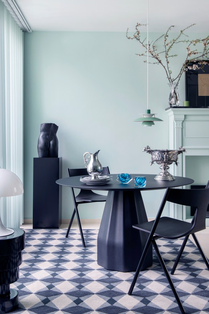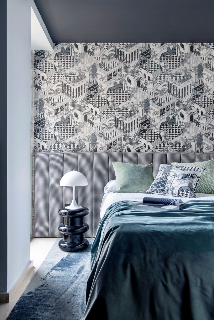 El dormitorio es una cápsula de calma gráfica y confort. El papel pintado, con un patrón arquitectónico en blanco y negro, evoca jardines clásicos y crea profundidad visual. El cabecero tapizado en gris con textura de raya diplomática añade confort y sobriedad. Por su parte, los cojines y la ropa de cama en terciopelo verde y azul remiten a la paleta del conjunto. La mesita negra de formas cilíndricas y la icónica lámpara blanca aportan coherencia formal al diseño.