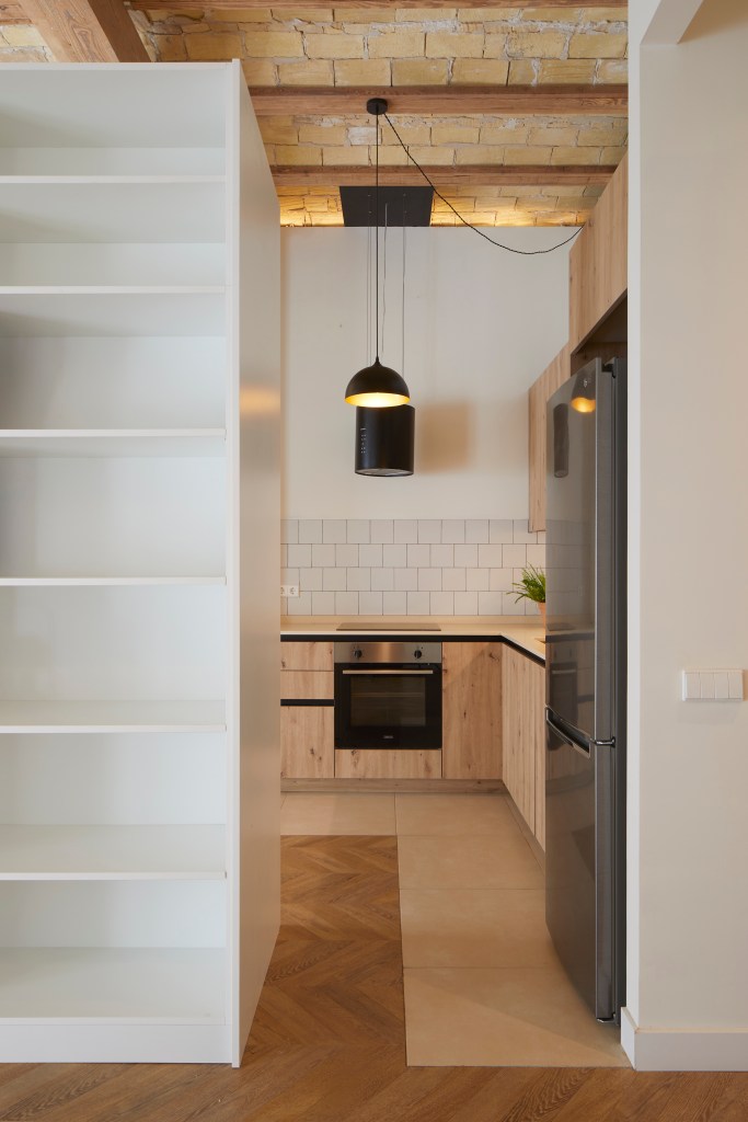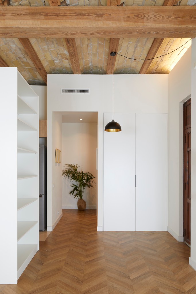 Bajo un forjado de vigas de madera, con revoltón de ladrillo macizo y más de tres metros de altura, transcurre la vida en este apartamento.